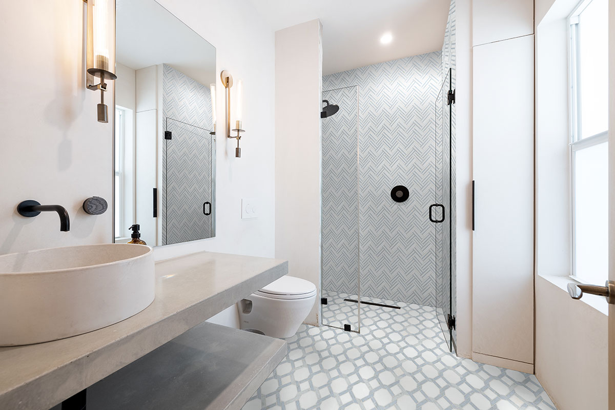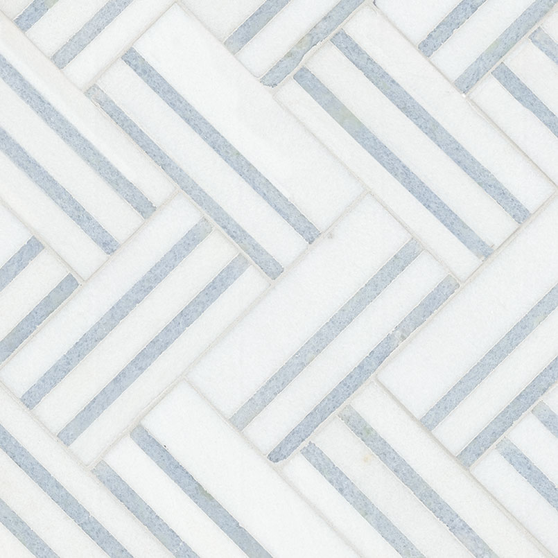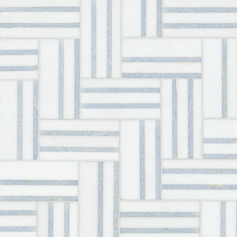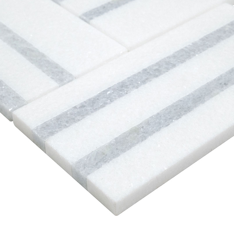 Azula Linea Mosaic Tile features a stunning white marble base adorned with a light blue and gray geometric pattern, creating a striking visual appeal. The polished finish enhances its elegance, while the mesh backing ensures easy installation for a seamless look. Perfect for stylish accent walls, backsplashes, and even residential floors, this tile effortlessly combines modern design with timeless beauty, making it a versatile choice for any interior space.