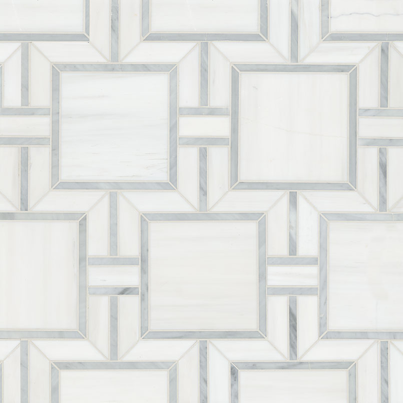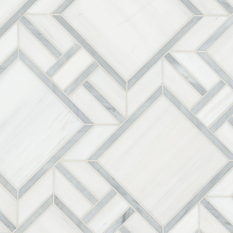 Bianco Dolomite Alana features a polished white marble background with a unique geometric pattern accented by light gray veining, creating a distinctive and elegant look. Ideal for decorative walls, residential floors, and more, this versatile tile brings sophistication to kitchens, bathrooms, and beyond. Its refined design and timeless appeal make it a perfect choice for enhancing a variety of spaces with style and grace.