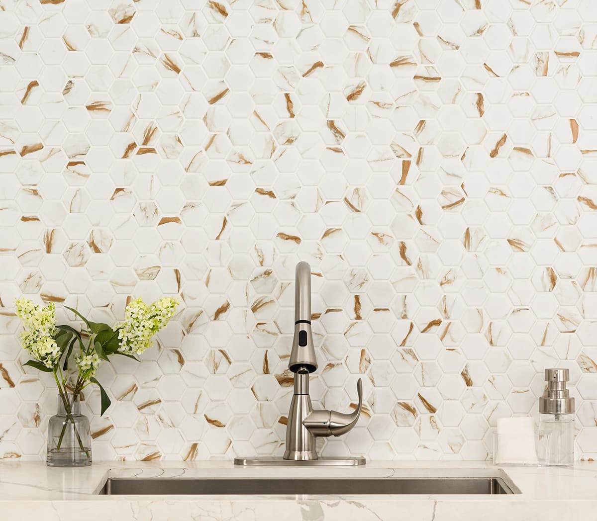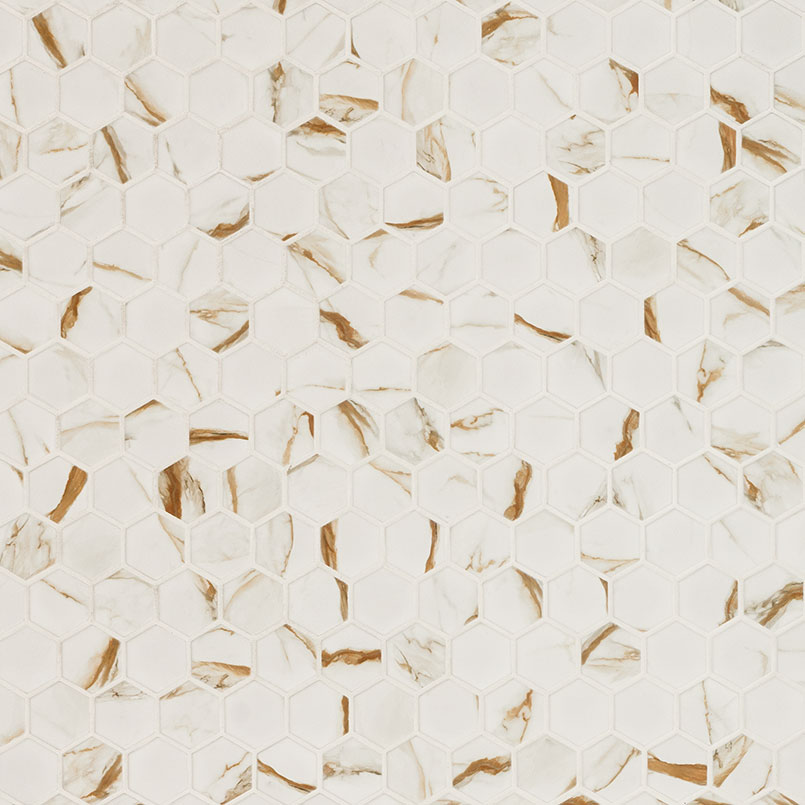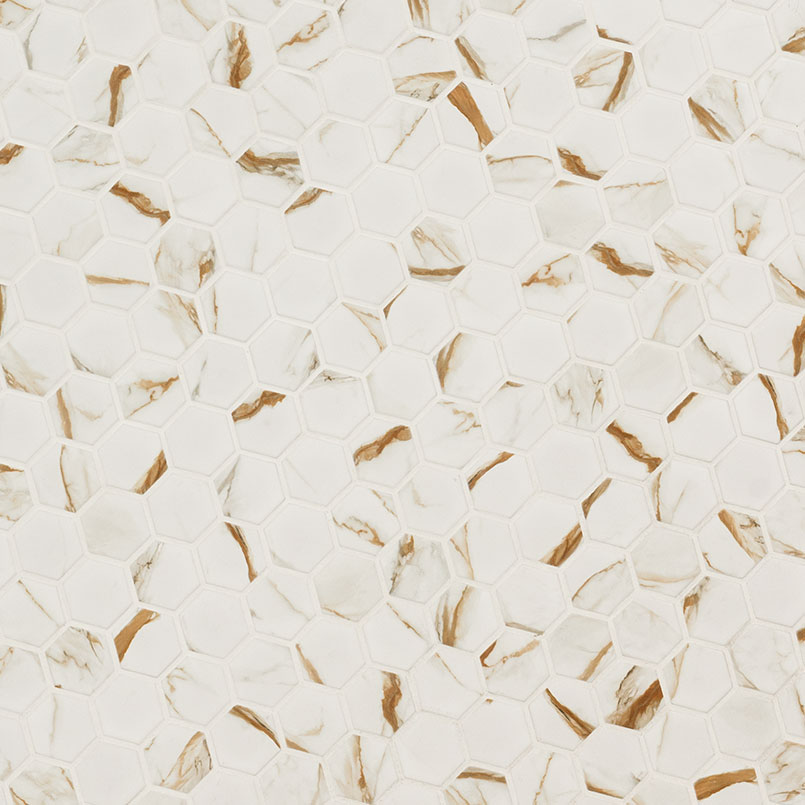 Immerse yourself in the charm of the Calacatta Gold Mosaic Tile. These mesmerizing 2″ hexagon tiles showcase a stunning white background embellished with striking gold veins, resulting in an authentic marble-like look. With a matte finish, these enchanting mosaics are effortlessly elevated with a mesh backing, making installation a breeze. Whether you aspire to create stylish accent walls, backsplashes, or even residential floors, these extraordinary porcelain tiles epitomize elegance and sophistication. Transform your space with these exquisite tiles and indulge in a world of refined beauty.