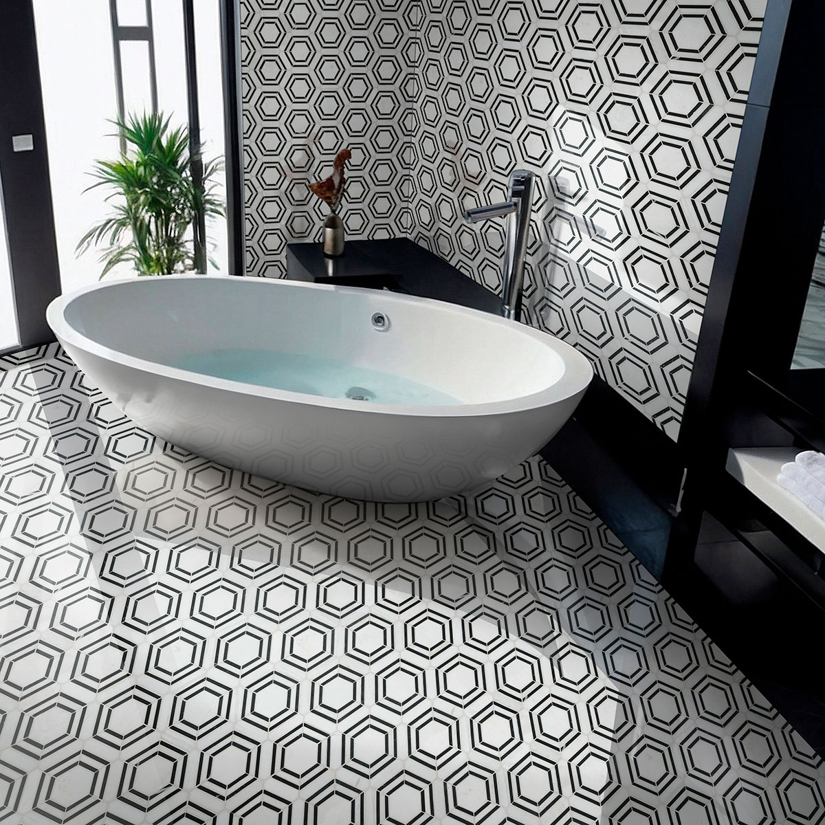 Georama Nero Geometric Tile is black and white marble tiles in stylish hexagon shapes. The modern design of this backsplash tile is perfect for cool countertops, pretty patterned wall tiles, and gorgeous geometric floor tiles.