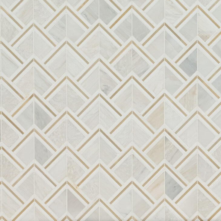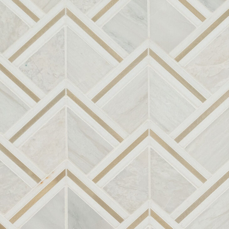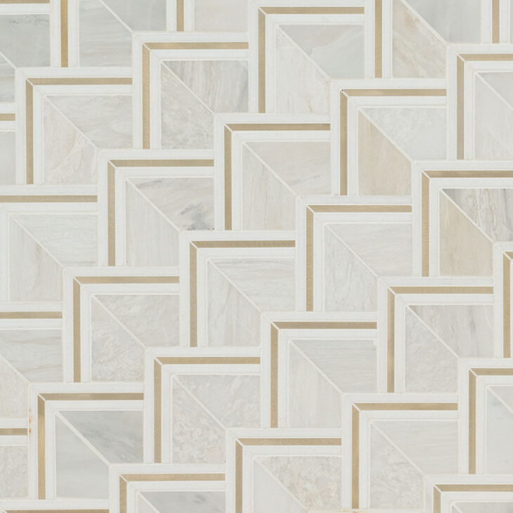 Luxor Kona Gold Pattern Tile features a gorgeous combination of warm whites, soft greys, creamy beiges accented by gold for a luxe look that is sure to make a statement. The tiles are made from stone and metal, adding a textural element and working well with various color schemes and architectural styles. The geometric-patterned tile is ideal for countertops, kitchen backsplashes, bathrooms walls, and more. The perfect solution for residential and commercial applications, Luxor Kona Gold Tile is durable, and easy to install, offering a professional finish.