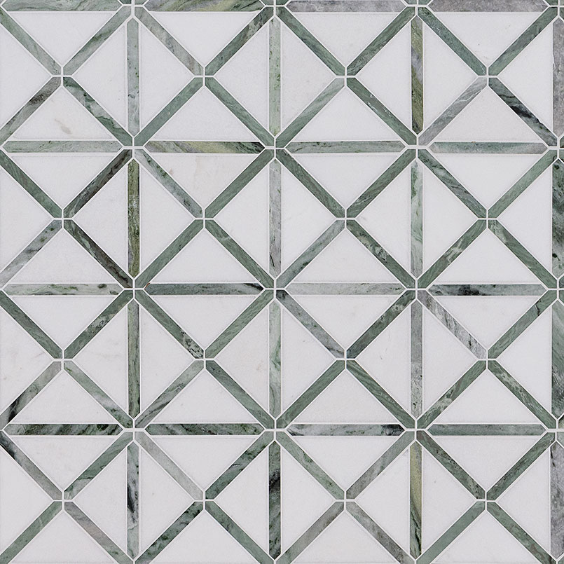 The Verdant Green Geometrica Pattern Tile effortlessly delivers a subtle yet captivating presence, blending shades of cream and tan with geometric green accents. The distinctive pattern of this marble mosaic tile captures attention, lending an air of sophistication and coziness to your space. With its mesh-backed design, this tile offers versatility for both residential and commercial applications, seamlessly complementing various design styles. Whether adorning a small or large bathroom, the kitchen, or any other area in need of style and elegance, this tile is the perfect choice.
