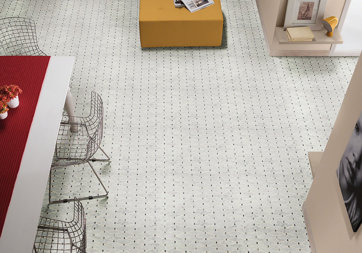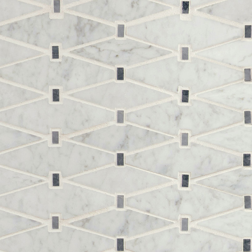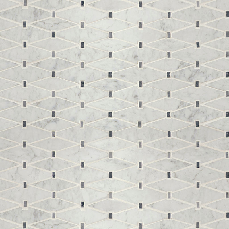 Marbella Diamond Tile features classic white marble accented by touches of gray marble in a unique elongated diamond pattern. Its understated elegance makes it ideal as patterned wall tiles, geometric floor tiles, and backsplashes in any room. With its neutral color and delicate design, Marbella Diamond complements a wide variety of color schemes and decorative choices. This backsplash tile is Greenguard Indoor Air Quality Certified® and come mounted on mesh-backed sheets for simplified installation and a professional finish.