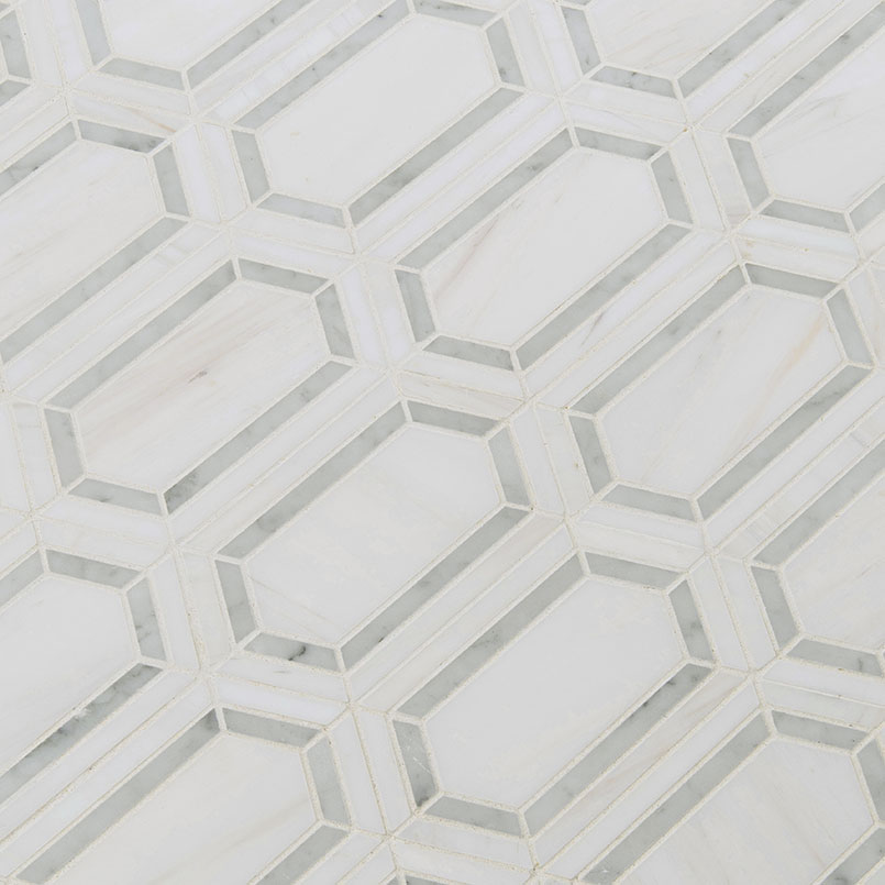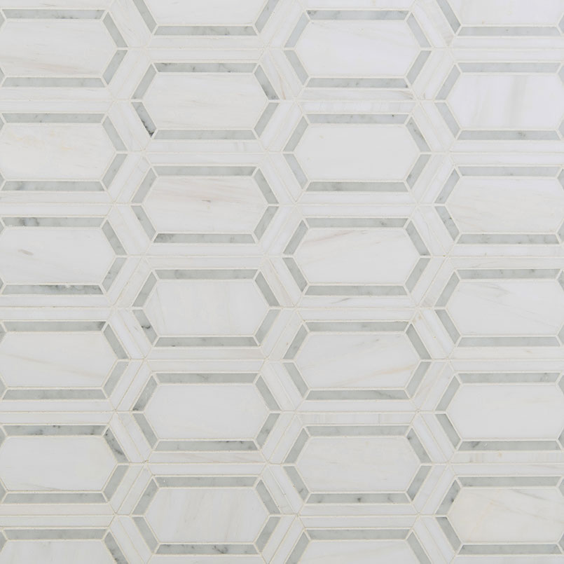 Pavilion Marble Picket Tile offers a bold unapologetic hexagon white pattern. The undeniably beautiful polished pattern opens new doors to creative interior design. A perfect choice for a stand out flooring installation or unique selection for an accent wall or bathroom vanity surrounding. A wonderful complement to bohemian or contemporary home and office design masterpieces.